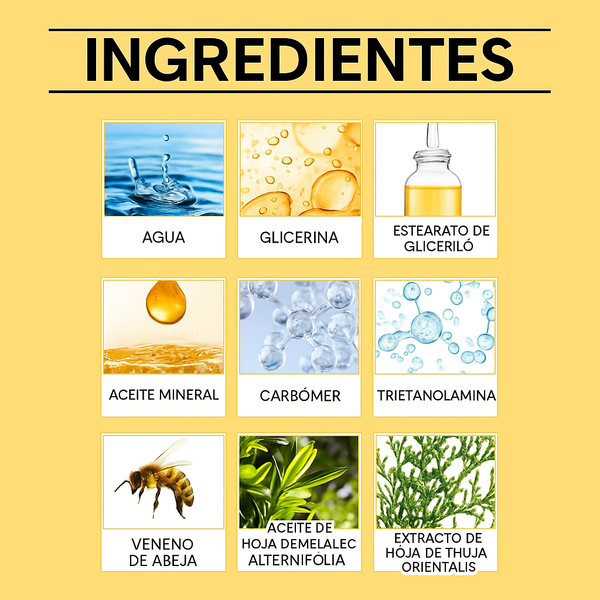 La crema contiene veneno de abeja que activa la producción de colágeno, reafirmando la piel y mejorando su elasticidad de manera natural.